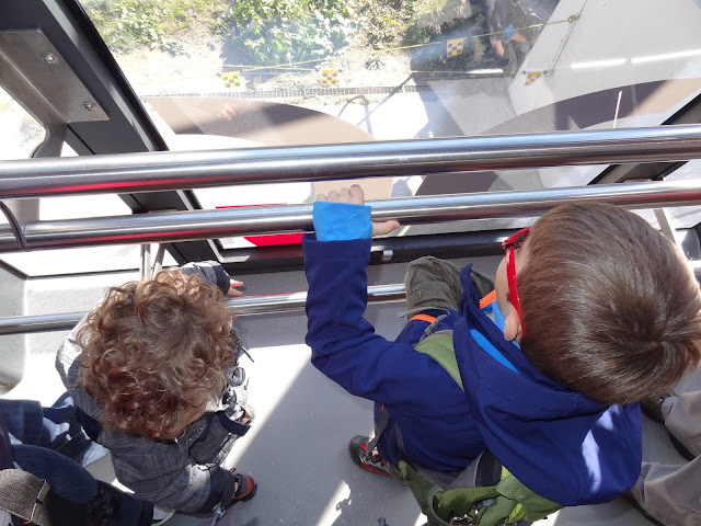 Oben angekommen, werden wir mit einer gigantischen Aussicht belohnt. Die Buben werfen sich strahlend in den ersten Schnee und turnen an einer Stange um die Wette.