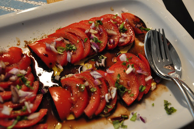 mit Tomatensalat, roten Zwiebeln und Basilikum: